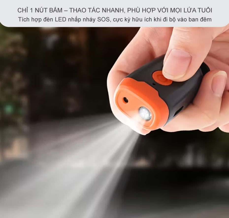 Chỉ 1 nút bấm – thao tác nhanh, phù hợp với mọi lứa tuổi, tích hợp đèn LED nhấp nháy SOS hữu ích khi đi đêm
