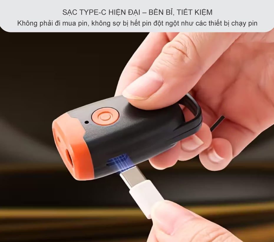 Một trong những điểm “ăn tiền” của chiếc còi này là nó dùng cổng sạc Type-C, nghĩa là bạn có thể dễ dàng sạc pin bằng dây sạc điện thoại Type-C thông dụng rất đơn giản. Không phải đi mua pin, không sợ bị hết pin đột ngột như các thiết bị chạy pin rời. Những ai bận rộn, hay ra ngoài nhiều sẽ cực kỳ thích điểm này. Nhiều khách chia sẻ rằng chỉ cần sạc một lần là xài cả tuần, vì bình thường đâu phải ngày nào cũng gặp chó. Khi cần thì máy luôn sẵn pin, không lo “tới lúc cần thì hết pin”. Điều này đặc biệt tiện cho người làm giao hàng, sinh viên đi đêm, hoặc người thường xuyên di chuyển.