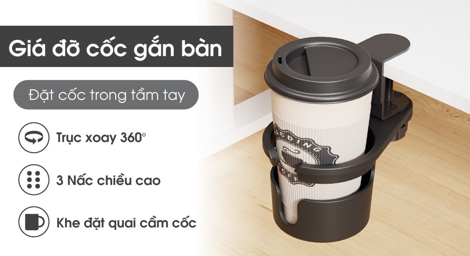 Giá đỡ cốc gắn bàn xoay 360 độ chính là giải pháp thông minh để chấm dứt tình trạng này. Ly nước được cố định chắc chắn ở ngoài mép bàn, vừa an toàn, vừa tiết kiệm diện tích, trả lại cho bạn một không gian làm việc rộng rãi và gọn gàng hơn. Với thiết kế xoay gọn khi không dùng, 3 nấc điều chỉnh độ cao tiện lợi và kẹp bàn chắc chắn, giá đỡ cốc không chỉ bảo vệ ly nước khỏi những pha “tai nạn bất ngờ”, mà còn biến góc làm việc của bạn trở nên ngăn nắp và hiện đại hơn bao giờ hết.