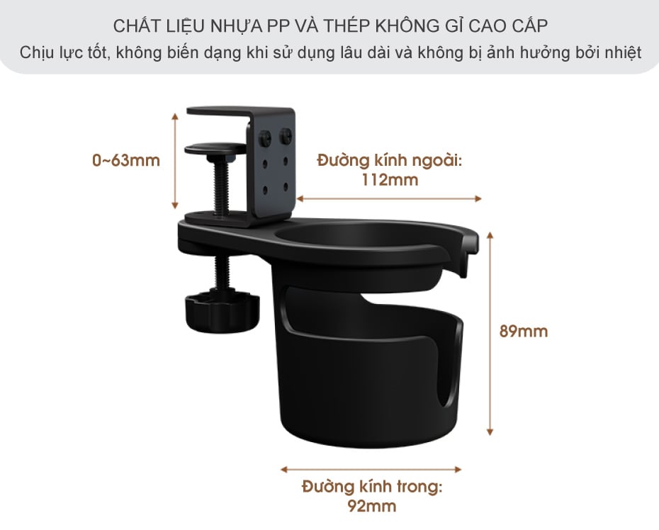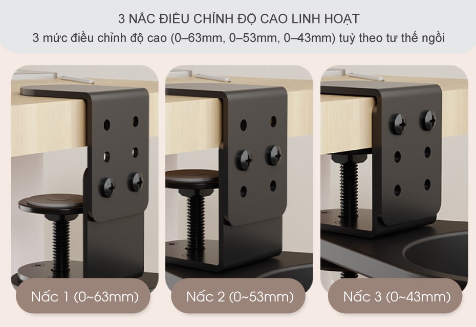 Không phải ai cũng có thói quen đặt ly nước ở cùng một độ cao. Người thì thích để ngang tầm tay, người lại muốn thấp hơn một chút để dễ với lấy. Giá đỡ cốc ly nước kẹp bàn được thiết kế với 3 mức điều chỉnh độ cao khác nhau (0–63mm, 0–53mm, 0–43mm), giúp bạn dễ dàng tùy chỉnh sao cho phù hợp nhất với tư thế ngồi và thói quen sử dụng.