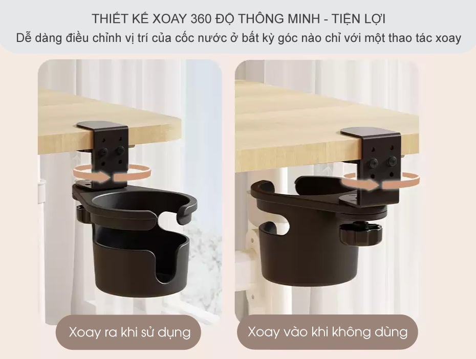 Không gian bàn làm việc thường rất hạn chế, và bất kỳ món đồ nào cũng cần được sắp xếp hợp lý. Với thiết kế xoay 360 độ, giá đỡ cốc cho phép bạn dễ dàng điều chỉnh vị trí của cốc nước ở bất kỳ góc nào chỉ với một thao tác xoay nhẹ, đảm bảo lấy nước thuận tiện mà không lo đổ. Khi không cần sử dụng, chỉ cần xoay gọn giá đỡ vào phía dưới bàn, ngay lập tức không gian bàn trở nên rộng rãi hơn.
