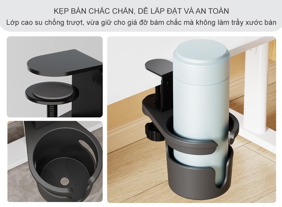 Giá đỡ cốc xoay 360 độ được thiết kế kẹp bàn chắc chắn, có thể dễ dàng siết chặt và điều chỉnh vào mép bàn hoặc thành ghế ghế chỉ bằng vài thao tác đơn giản. Phần kẹp có lớp cao su chống trượt, vừa giữ cho giá đỡ cốc bám chắc mà không làm trầy xước bề mặt bàn. Khi lắp đặt, bạn chỉ cần vặn nhẹ là cố định, không cần khoan hay dụng cụ phức tạp, ai cũng có thể thao tác nhanh chóng. Đặc biệt, giá kẹp cốc tại bàn vẫn giữ được sự an toàn ngay cả khi bàn bị rung, xê dịch hoặc có lực tác động nhẹ, giúp bạn hoàn toàn yên tâm khi đặt nước uống.