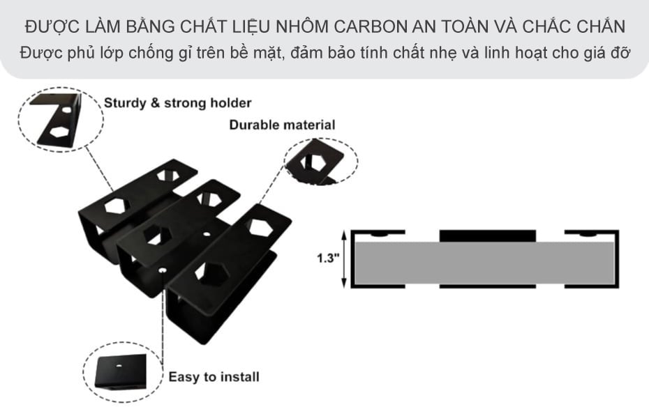Giá đỡ máy tính xách tay gắn dưới bàn được làm bằng chất liệu nhôm carbon an toàn và chắc chắn với lớp phủ chống gỉ trên bề mặt ngoài ra sẽ không làm trầy xước thân máy hay va quẹt khi sử dụng. Với chất liệu nhựa carbon giá đỡ sẽ đảm bảo tính chất nhẹ và linh hoạt giúp giảm tải trọng lên bề mặt bàn, thuận tiện cho việc di chuyển hay thay đổi vị trí giá đỡ dễ dàng hơn.