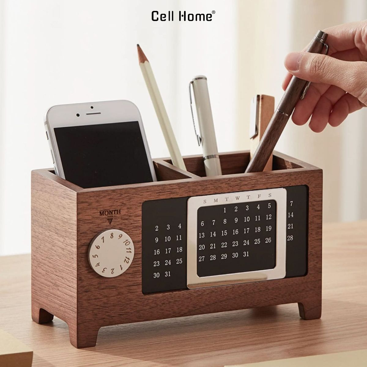 Thiết kế lịch vạn niên độc đáo ngay trên hộp bút với nút xoay chọn tháng và khung di chuyển ngày. Bạn có thể dễ dàng điều chỉnh theo ngày, tháng bất kỳ mà không cần lịch giấy truyền thống. Hộp bút gỗ để bàn vừa là phụ kiện trang trí sang trọng, vừa giúp bạn dễ dàng theo dõi thứ ngày tháng nhanh chóng. Các chi tiết được in rõ ràng, dễ nhìn và có thể sử dụng vĩnh viễn. Thiết kế này không chỉ thực tế mà còn mang lại sự tiện nghi và cảm giác hiện đại cho không gian làm việc.