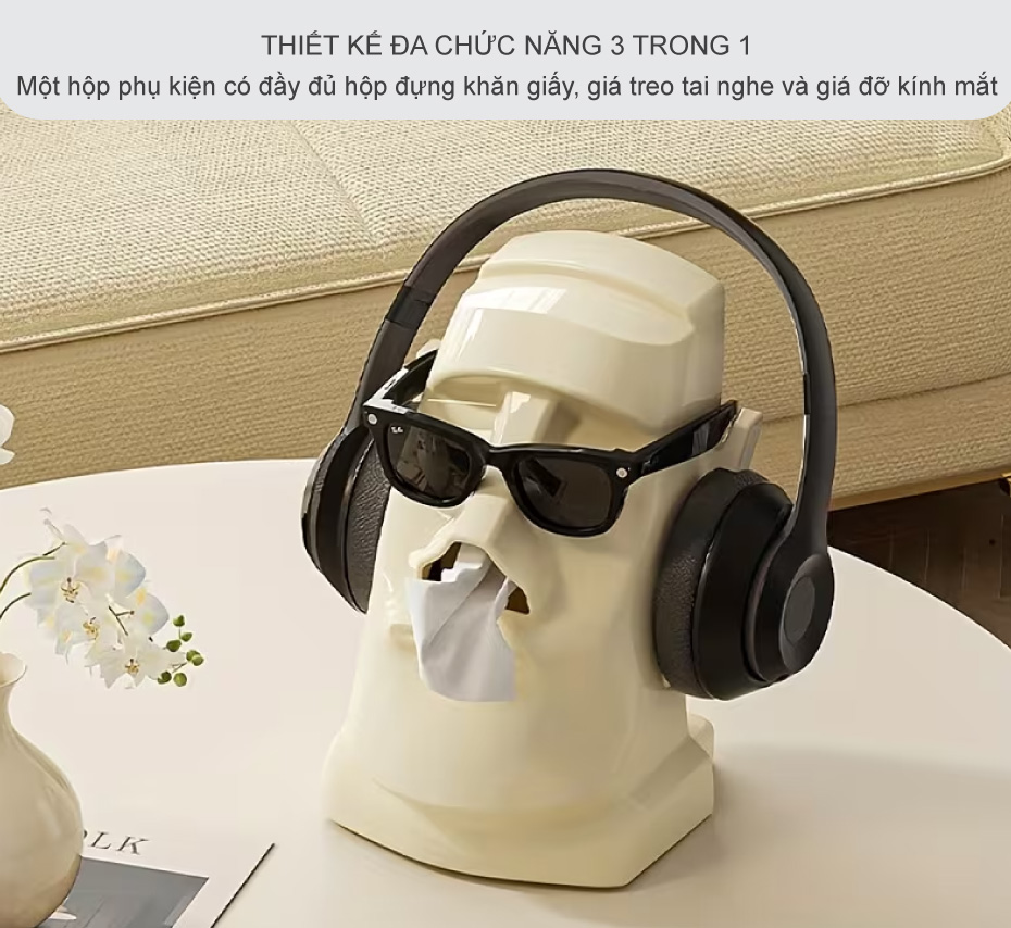 Điểm "ăn tiền" nhất của hộp đựng khăn giấy tượng Moai chính là thiết kế đa năng 3 trong 1 cực kỳ thực tế. Chỉ với một hộp phụ kiện, bạn đã có đầy đủ hộp đựng khăn giấy, giá treo tai nghe và giá đỡ kính mắt. Thay vì phải mua riêng từng món và sắp xếp rải rác trên bàn, Moai giúp mọi thứ được vừa gọn vừa độc.