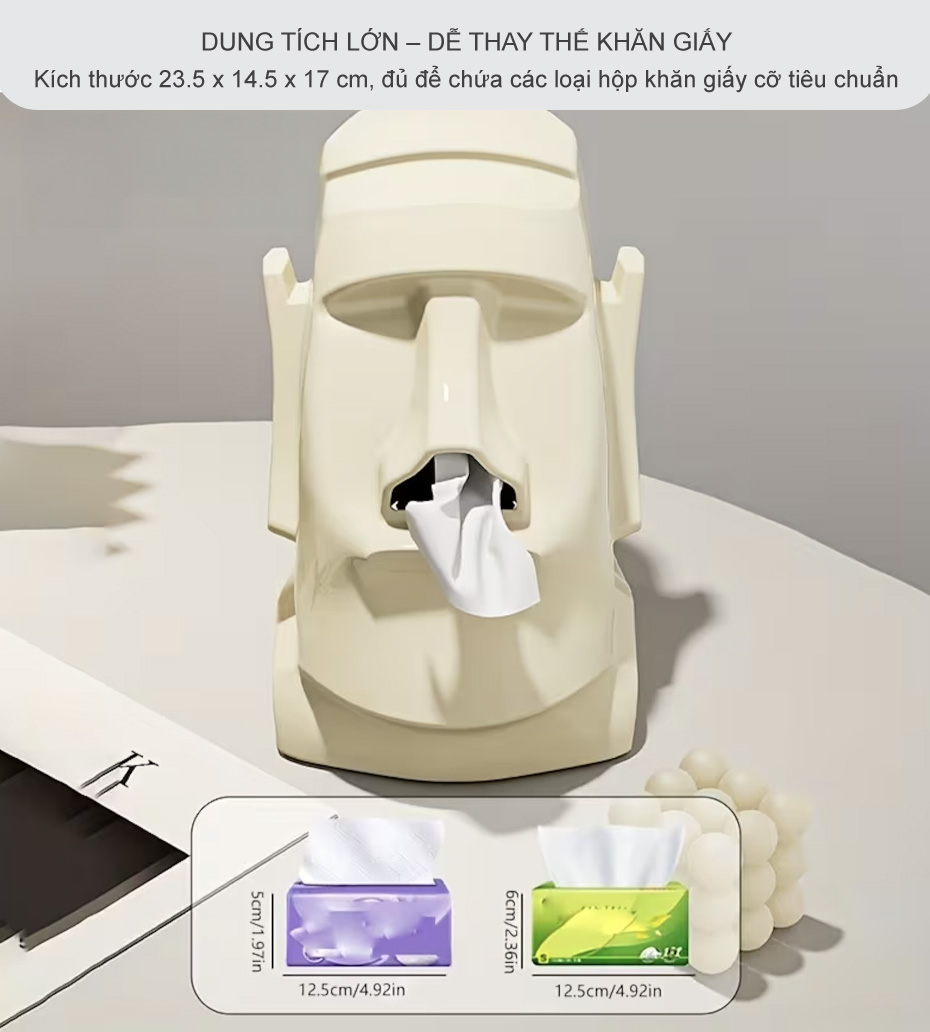 Lấy cảm hứng từ tượng Moai đảo Phục Sinh, hộp đựng khăn giấy không chỉ là vật dụng sinh hoạt mà còn là món đồ trang trí độc đáo và rất "có gu". Thiết kế lạ mắt, rất dễ gây ấn tượng khi đặt trên bàn làm việc, kệ sách hoặc bàn phòng khách.
