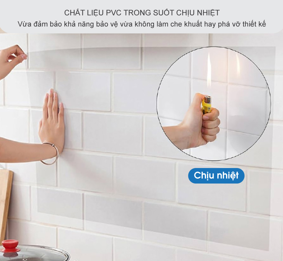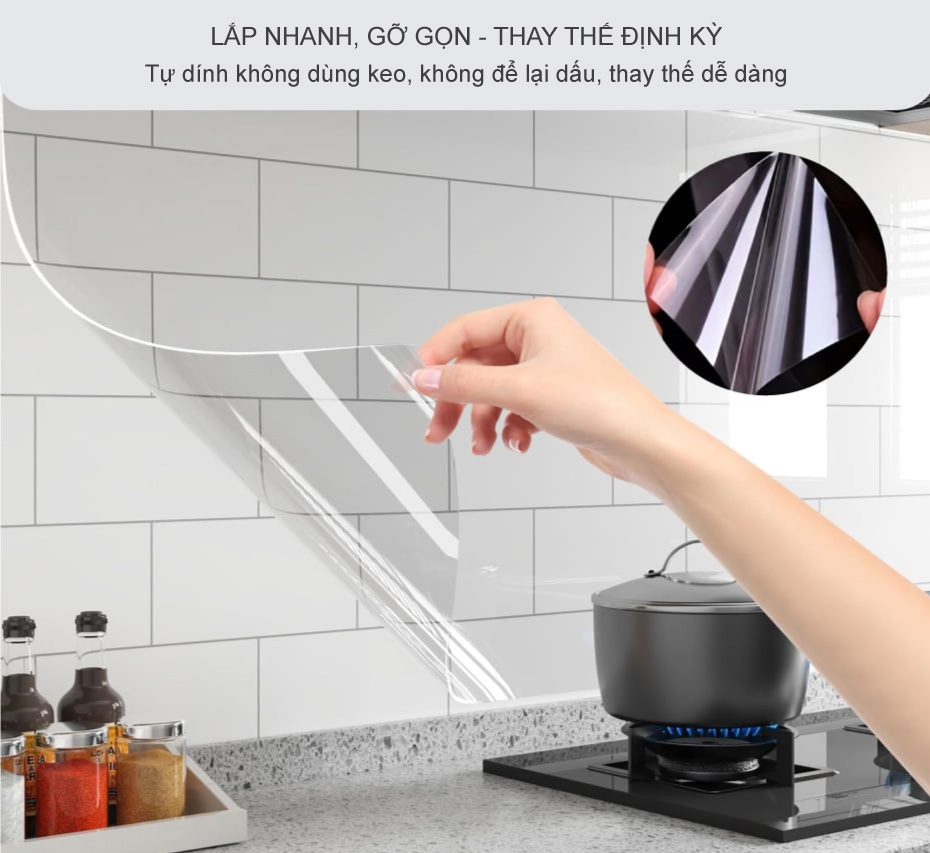 Miếng chắn chống dầu mỡ được làm từ PVC trong suốt chịu nhiệt, vừa bảo vệ bề mặt tường, vừa giữ nguyên vẻ đẹp ban đầu của gạch ốp hay kính bếp. Bề mặt được xử lý chống dầu và chống nước, chỉ cần lau nhẹ là sạch, không cần dùng hóa chất mạnh. Lớp keo tự dính tiện lợi giúp bạn dán nhanh – gỡ dễ – không cần keo dán, không để lại dấu như giấy dán tường.