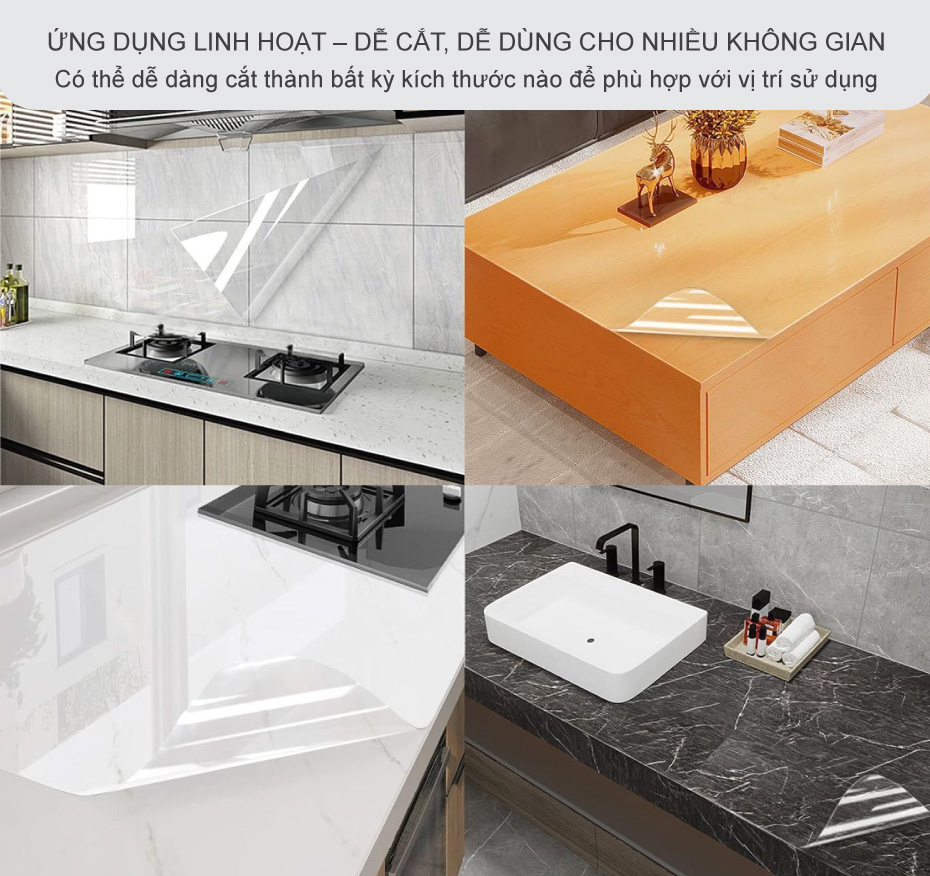 Việc dễ cắt và dễ dán giúp bạn tùy biến theo nhu cầu thực tế, không gây lãng phí và phù hợp với nhiều không gian khác nhau trong gia đình. Nhờ khả năng chống nước, miếng dán đặc biệt thích hợp cho các khu vực thường xuyên tiếp xúc với độ ẩm như bếp và phòng tắm, giúp bảo vệ bề mặt khỏi ố mốc và bám bẩn.