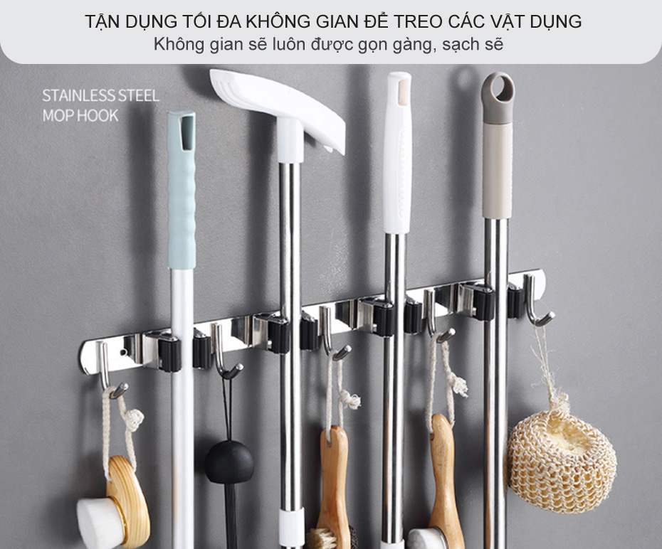 Móc treo cây lau nhà nổi bật với khả năng giúp bạn tận dụng tối đa không gian nhà tắm, các mảng tường còn trống để treo các vật dụng thường được để bừa bộn ở góc phòng tắm làm mất thẩm mỹ và vệ sinh như cây lau nhà, chổi, cọ toilet, bông tắm, chậu.. Nhờ vậy mà không gian sẽ luôn được gọn gàng, sạch sẽ, các vật dụng như cây lau nhà cũng được khô ráo nhanh chóng và mỗi khi cần dọn dẹp nhà tắm bạn cũng không cần phải xê dịch từng vật dụng như trước nữa.