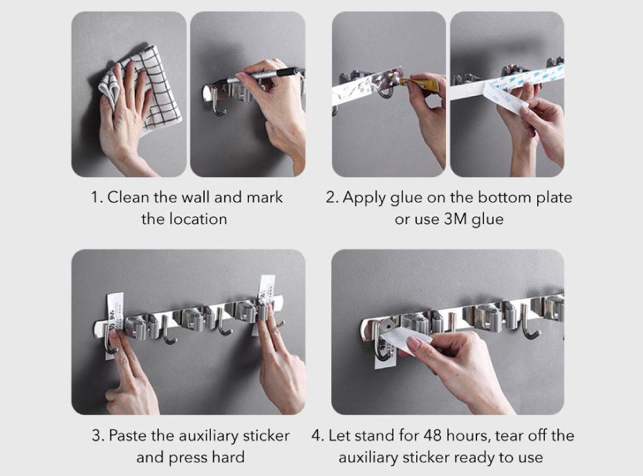 - Dùng keo dán chuyên dụng tản đều vào mặt sau và dán sản phẩm kẹp chổi lên nơi đã lau khô từ trước