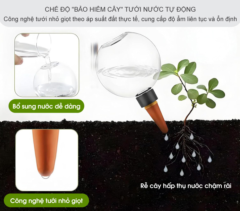 Nỗi ám ảnh về việc cây chết héo sau mỗi chuyến du lịch sẽ hoàn toàn biến mất. Không còn phải bận tâm nhờ vả hàng xóm hay lo lắng về những chậu cây khô khốc sau mỗi kỳ nghỉ lễ hay chuyến công tác dài ngày. Hệ thống tưới nước tự động của quả cầu nước tưới cây hoạt động dựa trên công nghệ tưới nhỏ giọt theo áp suất đất thực tế, đảm bảo cây luôn được cung cấp độ ẩm liên tục và ổn định. Thay vì phải có mặt tại nhà mỗi ngày để tưới nước thủ công, bạn có thể yên tâm xách vali lên và đi, bởi vì "người bảo mẫu" này sẽ làm thay công việc đó một cách mẫn cán nhất. Đây không chỉ là một dụng cụ tưới cây thông thường mà còn là thiết bị “bảo hiểm cây trồng” giúp bạn an tâm tận hưởng các chuyến đi xa chính khi ở nhà những chậu cây đã được chăm sóc.
