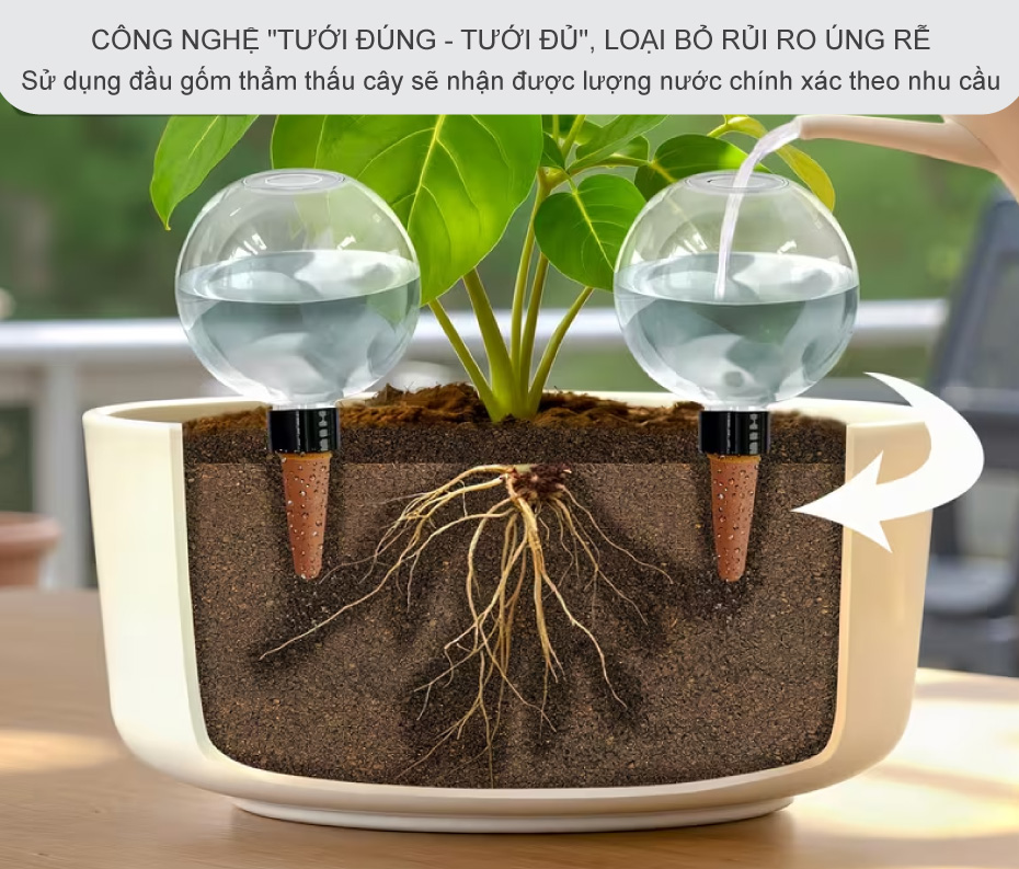 Thay vì đổ một lượng nước lớn lên mặt chậu khiến đất bị nén chặt và gây ngập úng nguyên nhân hàng đầu làm chết cây, dụng cụ tưới nước tự động này sử dụng đầu gốm thẩm thấu để nuôi dưỡng cây từ sâu bên dưới. Lợi ích trực tiếp là cây của bạn sẽ nhận được lượng nước chính xác theo nhu cầu sinh học của nó: khi đất khô nước sẽ chảy ra, khi đất đủ ẩm nước sẽ dừng lại. Điều này giúp bộ rễ luôn được giữ trong môi trường lý tưởng, thoáng khí và giàu oxy. Bạn sẽ không còn phải đau đầu đoán xem hôm nay cây cần bao nhiêu nước, thiết bị tưới cây này sẽ "đọc vị" độ ẩm của đất và cung cấp giải pháp dinh dưỡng hoàn hảo nhất cho cây mỗi giây, mỗi phút.