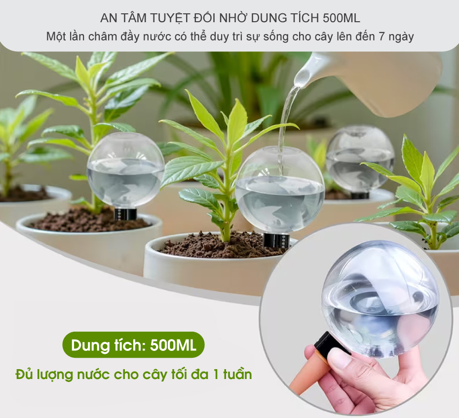 Với dung tích cực đại 500ml, bạn sẽ nhận được lợi ích về sự bền bỉ mà các loại dụng cụ nhỏ lẻ khác không có được. Một lần châm đầy nước có thể duy trì sự sống cho cây lên đến 7 ngày, giúp bạn cắt giảm tần suất phải chăm sóc cây xuống mức tối thiểu. Đây là giải pháp hoàn hảo cho những người yêu cây nhưng lại có tính "hay quên" hoặc quá bận rộn với công việc. Bạn không còn phải thấp thỏm mỗi sáng sớm hay chiều muộn nhớ xem mình đã tưới nước hay chưa, bởi vì bình chứa lớn này đã đảm nhiệm vai trò dự trữ nước hoàn hảo, đảm bảo cây trồng của bạn luôn tươi tốt, căng tràn nhựa sống ngay cả khi bạn quên bẵng chúng trong vài ngày. Hơn nữa, độ trong suốt giúp bạn kiểm soát mực nước chỉ bằng một ánh nhìn lướt qua từ xa, cực kỳ tiện lợi.
