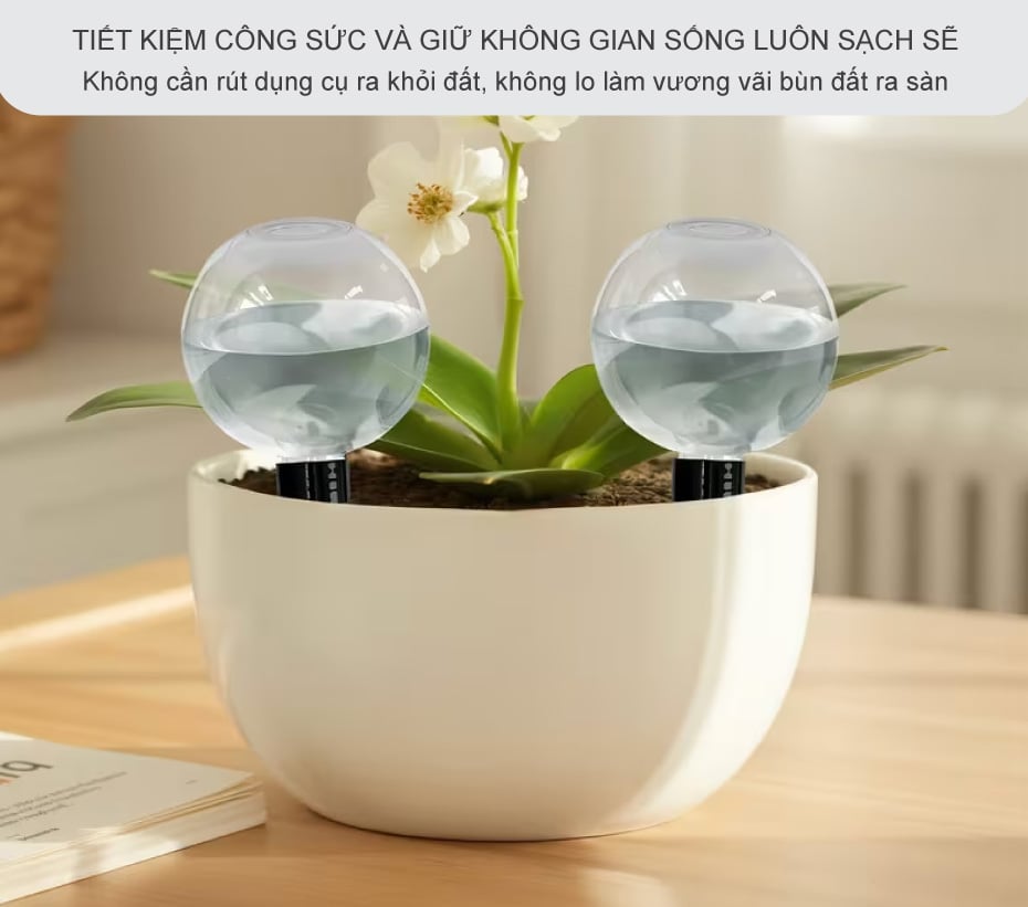Lối sống hiện đại đòi hỏi sự tinh gọn, và quả cầu tưới cây nhỏ giọt này mang lại sự tiện lợi tối đa cho bạn. Nhờ thiết kế lỗ châm nước phía trên, bạn có thể bổ sung nước cho cả vườn cây chỉ trong vài phút mà không cần rút dụng cụ ra khỏi đất, không lo làm vương vãi bùn đất ra sàn nhà hay làm hỏng cấu trúc bộ rễ. Điều này cực kỳ quan trọng đối với những người trồng cây trong căn hộ chung cư hoặc văn phòng làm việc cần sự sạch sẽ tuyệt đối. Bạn sẽ tiết kiệm được rất nhiều thời gian và công sức chăm sóc, biến việc chăm cây trở thành một trải nghiệm thư giãn thực sự chứ không còn là một "nhiệm vụ" lỉnh kỉnh, bẩn tay.