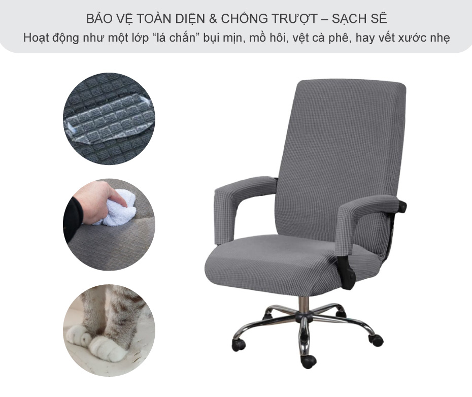 Ghế là nơi tiếp xúc liên tục với quần áo, da tay, đồ uống và cả… thú cưng. Vì vậy, vỏ bọc ghế văn phòng chống bụi – chống trượt hoạt động như một lớp “lá chắn” an toàn. Bụi mịn, mồ hôi, vệt cà phê, đồ ăn vụn hay vết xước nhẹ đều được hứng ở lớp bọc, giúp lớp ghế gốc sạch và bền lâu hơn. Phần tay vịn – khu vực mòn nhanh nhất – cũng được bảo vệ kỹ, hạn chế bong tróc giả da hoặc sờn vải. Dải bo thun 360° ở viền ôm sát thân ghế, hạn chế xô lệch khi ngồi đứng nhiều lần; bề mặt nhung gân có độ ma sát tự nhiên nên ít “trượt” kể cả khi bạn xoay người. Lúc cần vệ sinh, chỉ việc tháo bọc đem giặt máy, ghế bên dưới hầu như vẫn như cũ. Kết quả là bạn đỡ phải vệ sinh ghế gốc khó nhằn, đỡ lo mùi hôi bám lâu, và quan trọng hơn là kéo dài tuổi thọ chiếc ghế đắt tiền trong văn phòng hoặc home office.