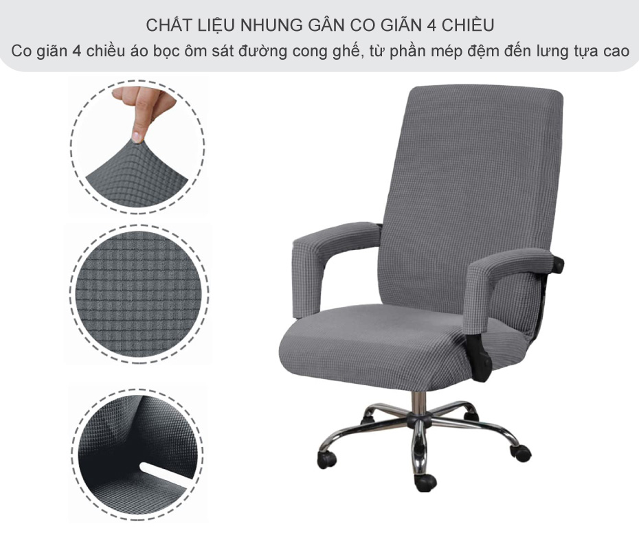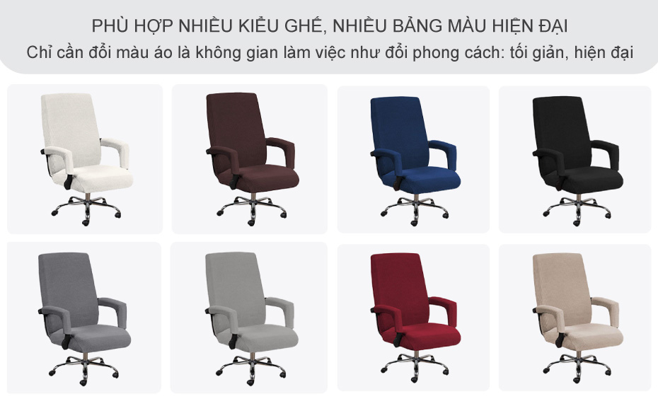 Vỏ bọc có độ co giãn linh hoạt, ôm được hầu hết ghế xoay văn phòng, ghế giám đốc lưng cao có tay vịn cơ bản. Khoảng kích thước đệm ngồi phổ biến 38–52 cm đều bọc vừa; phần lưng liền thân được áo ôm trọn, nhìn liền mạch. Về thẩm mỹ, bạn có nhiều màu: đen/xám dễ phối, be ấm áp, xanh navy/xanh than gọn gàng, đỏ rượu nổi bật… Chỉ cần đổi màu áo là không gian làm việc như đổi phong cách: tối giản, hiện đại hay Scandinavian đều “ăn nhập”. Với shop/văn phòng, bạn còn có thể chọn màu theo nhận diện thương hiệu để không gian đồng nhất hơn. Nhờ bề mặt nhung gân có chiều, ghế sau khi bọc nhìn “sang gu” và sạch sẽ hơn, rất hợp xu hướng home office gọn gàng ngày nay. Đây là món “phụ kiện nội thất” nhỏ nhưng tạo hiệu ứng lớn trên cả thẩm mỹ lẫn trải nghiệm sử dụng.