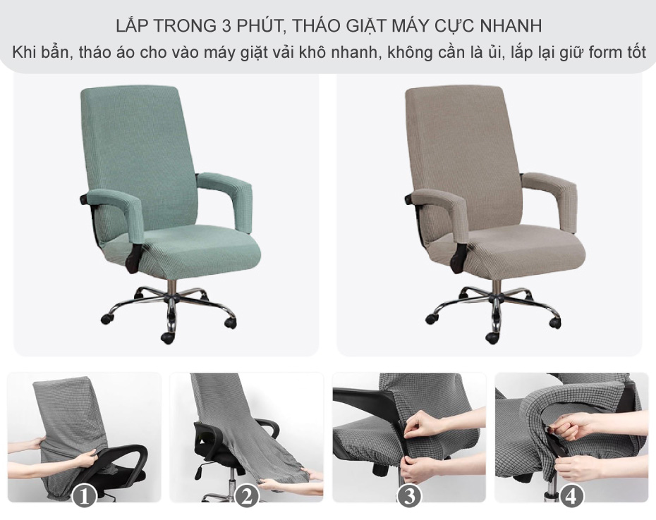 Không cần dụng cụ hay kỹ thuật đặc biệt. Cách làm rất đơn giản: kéo áo thân ghế trùm từ lưng xuống đệm, chỉnh cho đều gân, luồn các mép vào khe giữa lưng và đệm để phẳng phiu; sau đó bọc hai tay vịn bằng cặp ống bọc đi kèm là xong. Toàn bộ thao tác mất khoảng vài phút ngay lần đầu; những lần sau còn nhanh hơn. Khi bẩn, tháo áo cho vào máy giặt, chọn chu trình nhẹ, phơi/sấy nhiệt thấp là sạch sẽ. Vải khô nhanh, không cần là ủi, lắp lại giữ form tốt. Với văn phòng đông người, homestay/studio chụp ảnh hoặc gia đình có trẻ nhỏ – nơi ghế “dính chuyện” như đổ nước, bám bụi là bình thường – cơ chế vệ sinh kiểu này tiết kiệm thời gian rất nhiều so với lau chùi ghế gốc. Nhờ bo thun viền chắc tay, áo khó trượt trong quá trình sử dụng, nên bạn hầu như không phải chỉnh lại sau khi lắp.